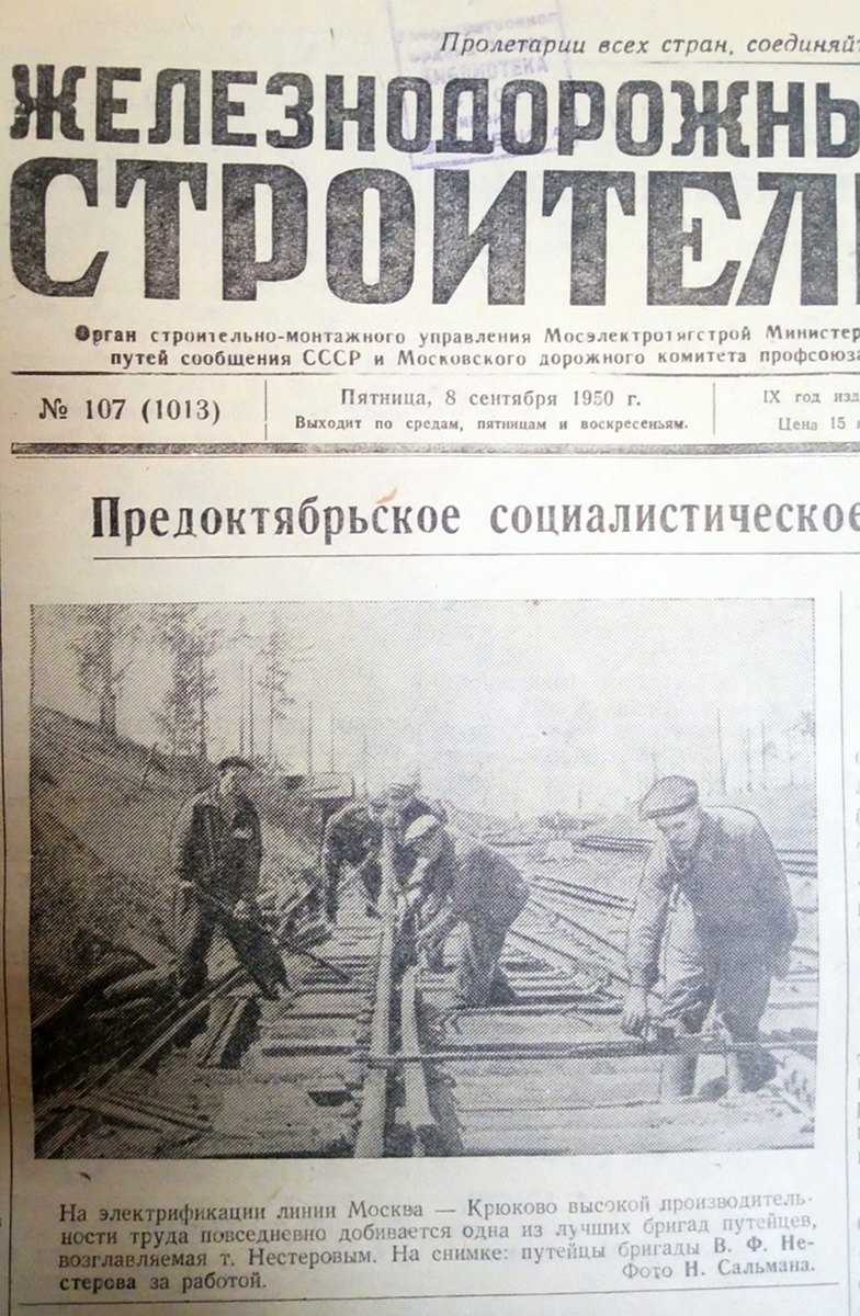 Но подробная история электрификации участка была написана в том же 1950 году. В вышеприведенных материалах несколько раз упоминается строительно-монтажный трест «Мосэлектротягострой» МПС (начальник — А. Барсков, главный инженер — Прохоров). У нее была собственная газета «Железнодорожный строитель», формат — один лист формата «таблоид». И работавшие в этой газете сотрудники, со знанием дела, прекрасно выполнили свою задачу: прямо говорили о проблемах, становившихся преградами для нормального проведения работ, высказывали претензии руководителям организаций и «смежникам», выделяли наиболее отличившихся передовиков. Больше всего корреспонденций по участку за подписью А. Тимченко.