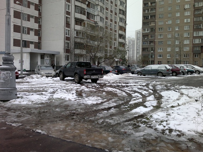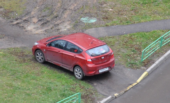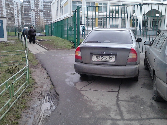 Hyundai Solaris с номерами Е 599 МХ 197 RUS, 8 ноября перекрывший пешеходную дорожку между корпусами 1106 и 1107. Фото пользователя форума Инфопортала Diskman. На водителя «соляриса» пожаловался также и читатель Инфопортала DarkwingDuck. «Другой дороги ведущей на площадку нет, так же как нет и другого прохода к корпусу 1107, 1108 и остановкам автобусов. В результате люди должны были обходить это чудо по грязи. Что уж говорить о детских колясках, с которыми вообще нужно было идти в обход. Не знаю, сколько простояло данное авто, но с 9 до 12 часов проход был точно перегорожен. Хамство не знает предела!» – справедливо возмущается читатель.
