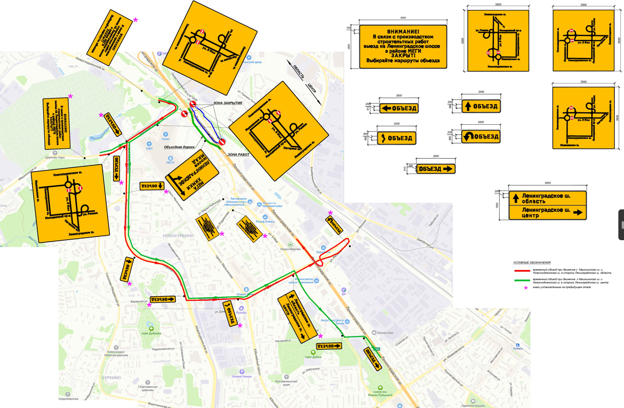 Группа «» в сети «ВКонтакте» предлагает следующую интерпретацию сути перекрытий и возможных путей следования в районе перекрытого участка: «Простым языком: Ленинградка сдвигается на улицу 9 мая, то есть часть этой улицы в районе монумента "Ежи" отдадут под шоссе. Если вы едете по Новосходне в сторону Москвы, и вам нужно на Ленинградку в область, то придется объезжать через Новокуркинское шоссе, улицу Дружбы и затем лишь на Репинской развязке можно будет свернуть в область. Если вам надо с Новосходни выехать на Ленинградку в Москву, то придется так же объезжать через все новые Химки через Юбилейный [проспект] или Нагорное шоссе. Если же вы едете в область по Ленинградке и хотите попасть на Новосходню, то теперь нужно будет заезжать на эстакаду, ведущую к "Меге". Поменяются и маршруты многих автобусов (22, 28, 370, 482, 50)».