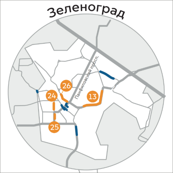 Согласно данной схеме, в Зеленограде готовятся организовать следующие выделенные полосы для автобусов: на Центральном проспекте и Солнечной аллее — примерно от префектуры до остановки «Поликлиника №105» (в направлении станции Крюково), почти на всем протяжении улицы Гоголя (в обоих направлениях), а также на двух участках улицы Каменки (в направлении Панфиловского проспекта).