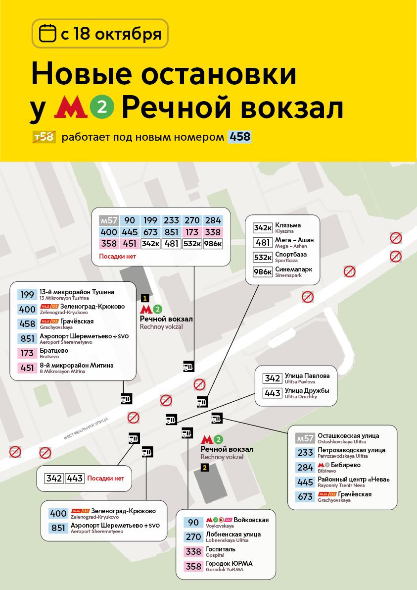 С субботы, 18 октября, остановки автобусов у станции метро «Речного вокзала» перенесут ближе к выходам из подземки. У 400-го автобуса появится новая остановка у южного вестибюля.