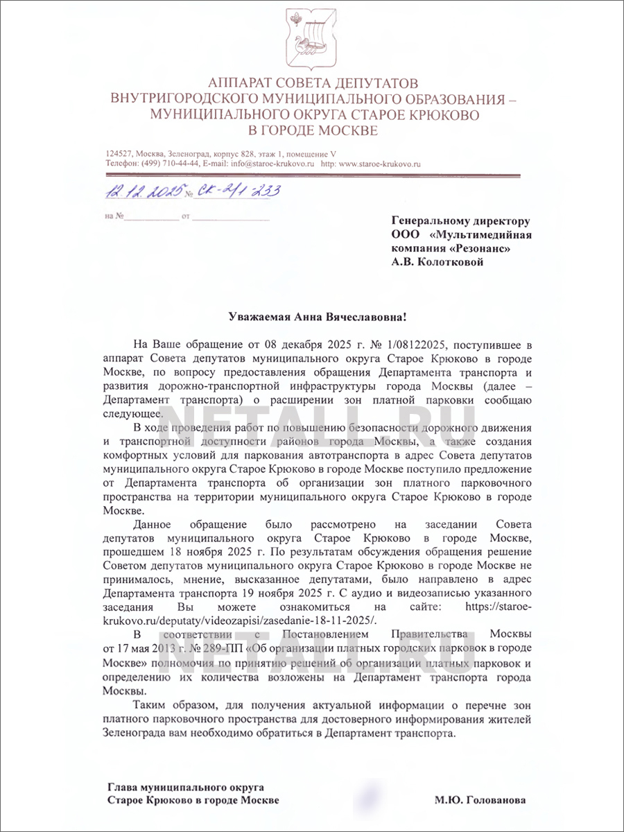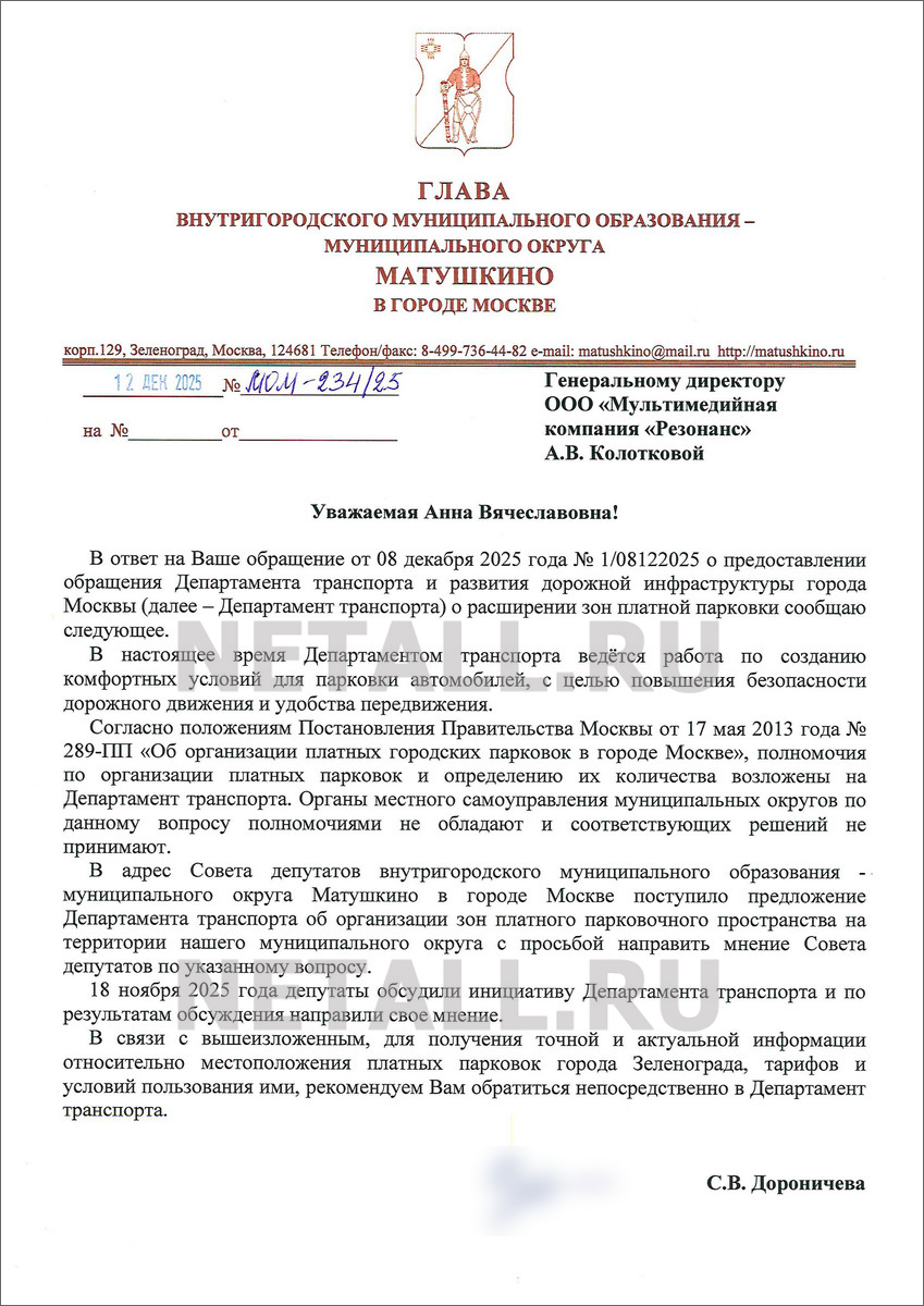 Соответствующие запросы Инфопортал направил в советы депутатов зеленоградских муниципальных образований 8 декабря. Напомним, за несколько недель до этого депутаты рассмотрели и предложения столичного департамента транспорта по расширению мест платной парковки в Зеленограде. На рассмотрение этих вопросов на заседаниях пяти советов депутатов в общей сложности около 15 минут. Из 42 депутатов пяти советов, которые участвовали в голосовании, 41 поддержал предложения, один человек воздержался. При этом никакие адреса на заседаниях не назывались. Депутаты объяснили это тем, что детально обсудили все на встречах профильных комиссий, которые проходят непублично. Из материалов департамента территориальных органов исполнительной власти Москвы лишь планы расширения платной парковки в районе Матушкино. В этом районе речь идет об участке проспекта Генерала Алексеева от Панфиловского проспекта до улицы Николая Злобина, Березовой аллее и на улице Летчика Полагушина.