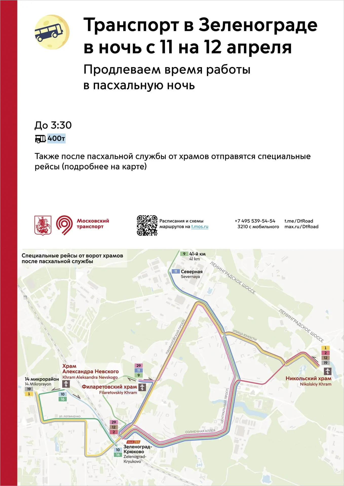 В пасхальную ночь с 11 на 12 апреля после окончания богослужений от зеленоградских храмов будут запущены специальные дополнительные рейсы автобусов: от Никольского храма пойдут автобусы маршрутов №1 и №19 до 14-го микрорайона и маршрутов №2 и №12 до станции Крюково. От Филаретовской церкви отправятся маршруты №9 до остановки «41-й километр», №11 и №29 до остановки «Северная». От храма Александра Невского близ 14-го микрорайона поедут автобусы №10 и №16.